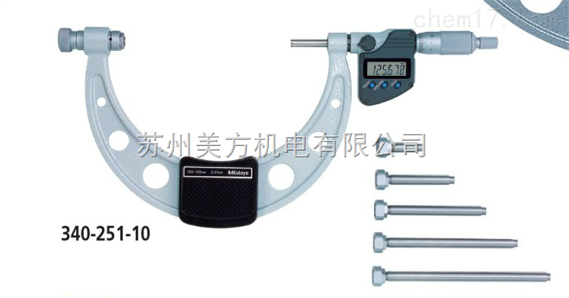 三丰可更换测钻数显外径千分尺340-522 测量范围500-600mm特点:1.带有可更换测砧的宽度测量范围。2.测微螺杆测量面是硬质合金(标准型) 。3.达到IP65尘/水防护等级(340系列)。* 测量范围为300mm以下型。4.棘轮锁紧装置可保持恒定测力